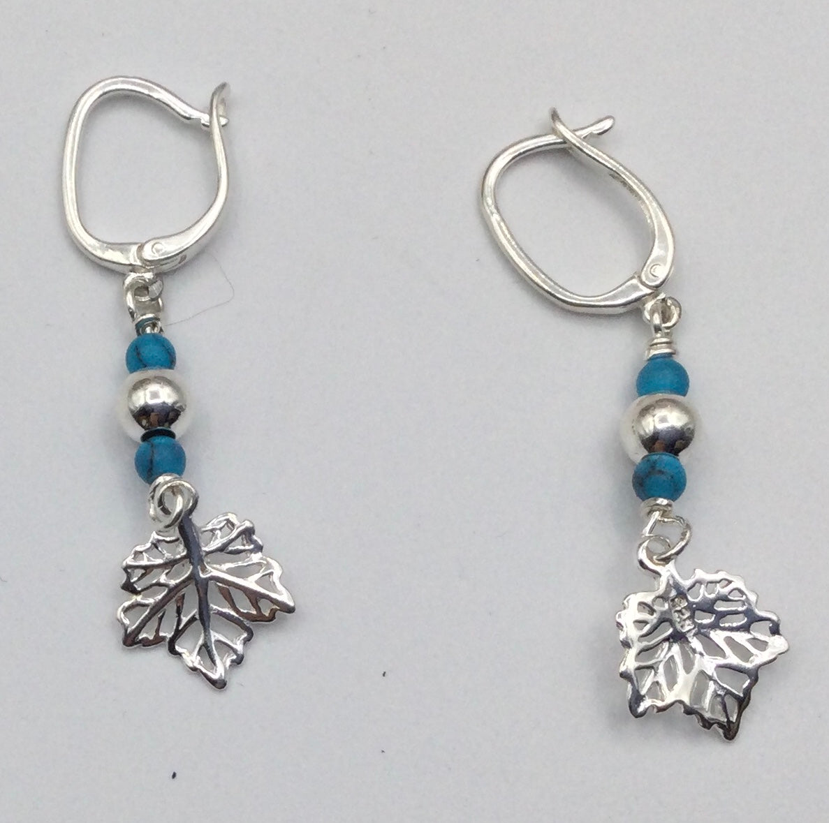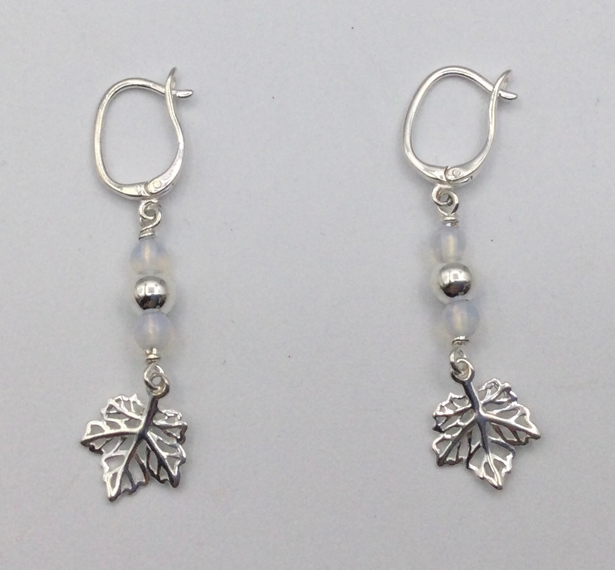 These earrings are fully Sterling Silver and feature a filigree maple leaf, and semi-precious stones. Available in Opalite (glass), Turquoise, and Red Bamboo Coral.