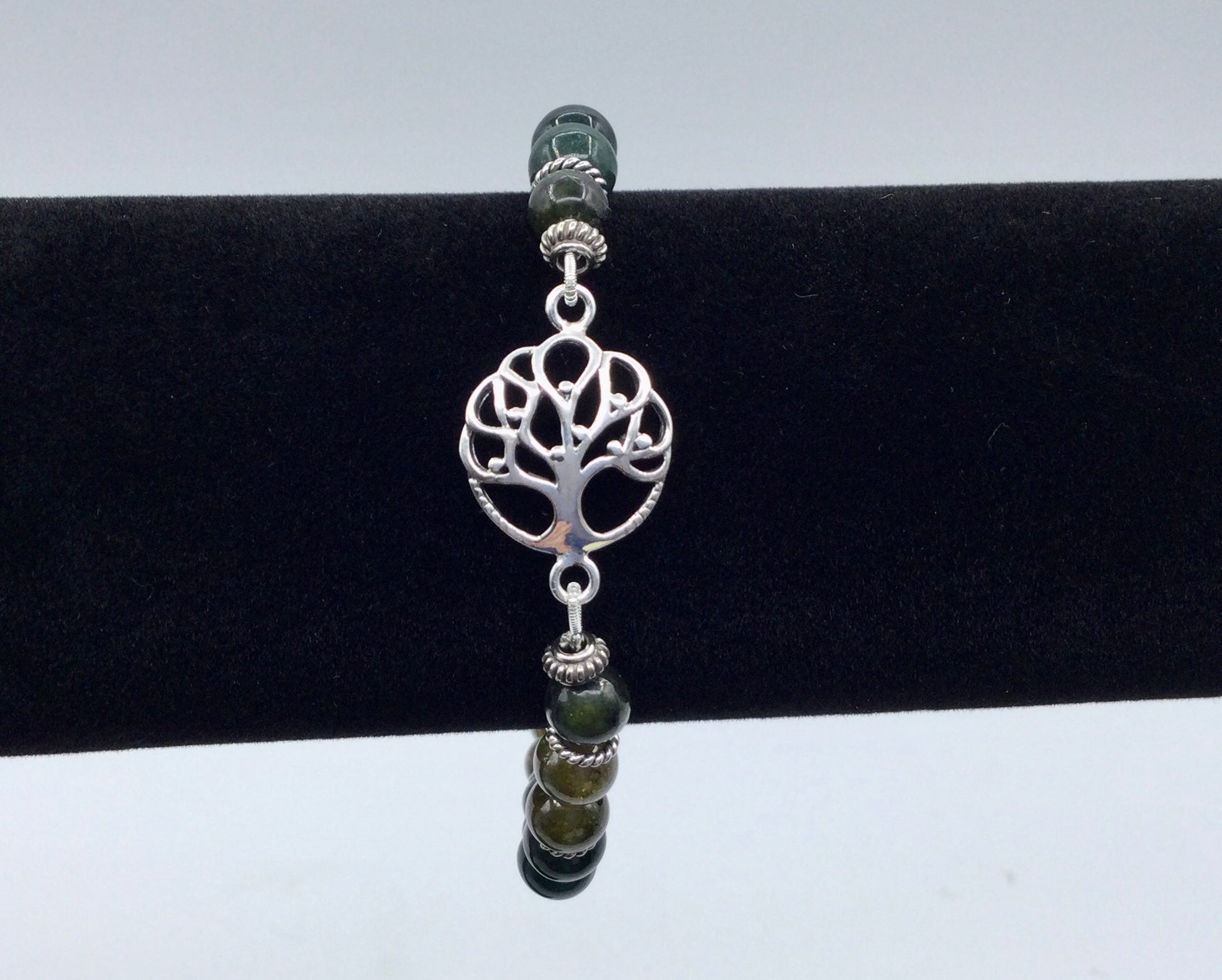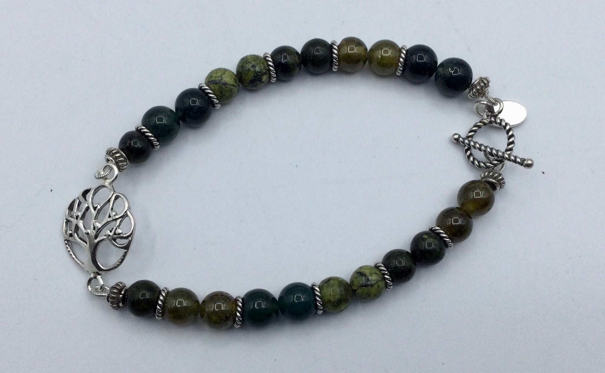 | This bracelet is fully Sterling Silver and features a Tree of Life Motif, along with various Jaspers, Jade, and Green Garnet. | |