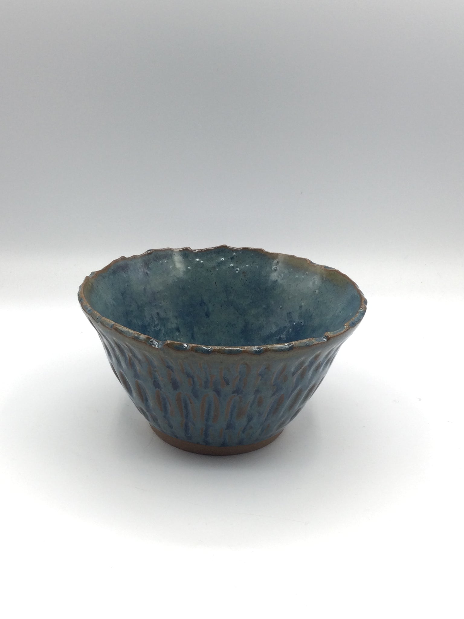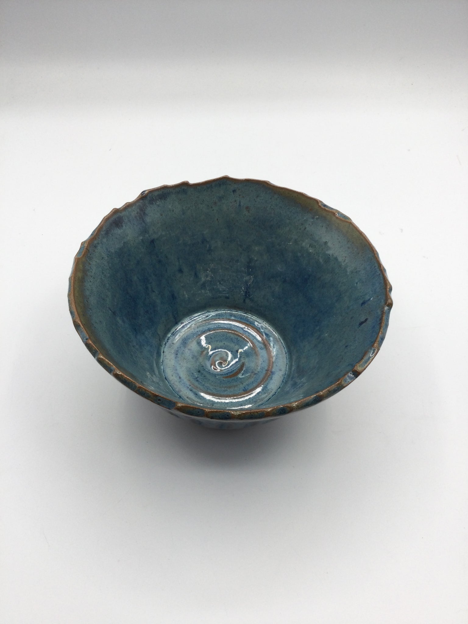 This medium-sized blue bowl features subtle edging details that add texture and elegance, making it both a functional and decorative piece for any table.
