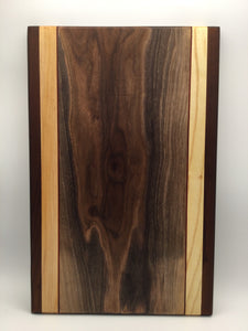 Finely crafted cutting/charcuterie board of black walnut, purple heart and maple.