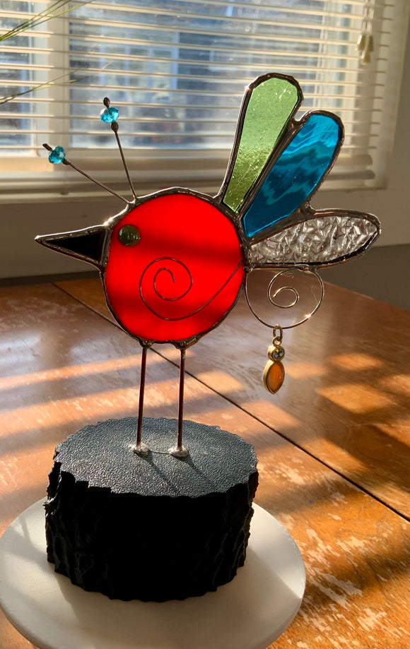 Stained glass silly bird with orange body and crystal beads on 3D base